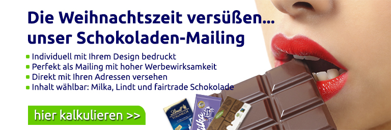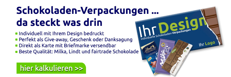 Individuelle Schokoladen-Verpackungen drucken bei Ihrer Online Druckerei PapeDruck.de: Wir liefern Ihnen individuell bedruckte Schokoladenverpackungen inkl. eingelegter, originalverpackter Tafeln, wahlweise mit Milka Vollmilch oder Lindt Vollmilch Schokolade. Ob als Dankeschön an Ihre Kunden, oder als Weihnachtskarte, diese Verpackung fällt auf und bleibt im Kopf.