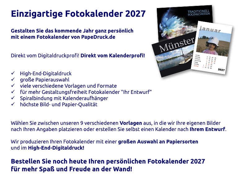 Individuelle Fotokalender drucken bei Ihrer Online Druckerei PapeDruck.de: Ein Fotokalender mit Ihren eigenen Fotos in höchster Qualität und in außergewöhnlich schönem Design.